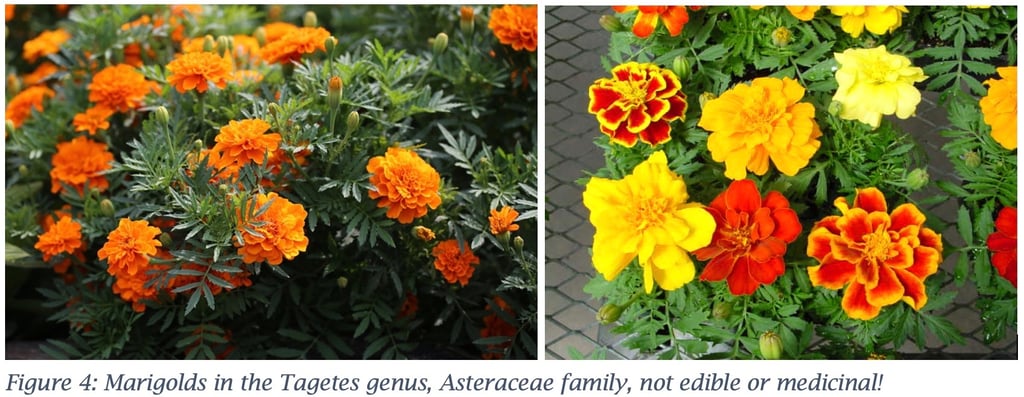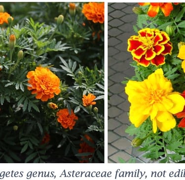 Calendula is not to be confused with the common garden marigold of the genus Tagetes! These are garden ornamentals and not edible, with many overlapping petals and highly dissected leaves. Although the Tagetes marigold is in the same family as Calendula, it is not interchangeable. See the photos below for comparison. [i]