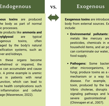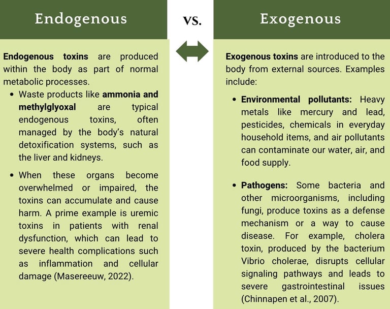 A toxin is any biologically active substance that can harm a living organism. These substances can be natural or human-made and have a wide range of effects on the body, from mild irritation to severe illness and even death. Toxins are found everywhere: in our food, water, air, and the products we use daily. Understanding the different types of toxins and their sources is crucial for minimizing our exposure and protecting our health. They can be broadly categorized into two main types: endogenous and exogenous. Both endogenous and exogenous toxins pose a health risk, and understanding where they come from and how to avoid them is essential for maintaining well-being (Crinnion & Pizzorno, 2019).