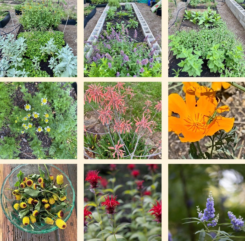 Anise Hyssop, Echinacea, Lavender, Holy Basil, Meadowsweet, White Sage, Violas, Calendulas, California poppy, Aloe vera, Chamomile, Spilanthes, Vitex, and Bee balm....just to show a few.
