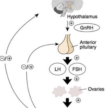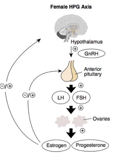In a healthy hypothalamic–pituitary–ovarian (HPO) axis, the hypothalamus releases gonadotropin-releasing hormone (GnRH) in a balanced, rhythmic pattern that stimulates the pituitary to secrete luteinizing hormone (LH) and follicle-stimulating hormone (FSH) in appropriate proportions. FSH supports ovarian follicle maturation, while a mid-cycle surge of LH triggers ovulation. Estrogen and progesterone then provide negative feedback to the hypothalamus and pituitary, helping regulate hormone production and maintain regular menstrual cycles.