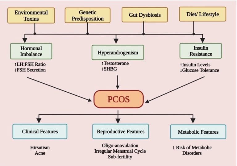 PCOS does not have a single cause. Instead, it arises from a convergence of genetic susceptibility and environmental influences that interact across the lifespan. Research suggests that genetic variants affecting insulin signaling, steroid hormone production, and inflammatory pathways can predispose some individuals to PCOS. These genetic tendencies may be amplified by epigenetic changes, particularly those occurring in utero or early life, which can alter how genes are expressed without changing the DNA itself. Prenatal exposure to excess androgens or environmental toxins may prime the body for hormonal dysregulation years before symptoms appear.