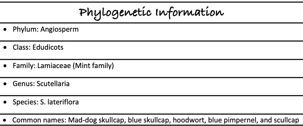 2 Chestnut School of Herbs, “Skullcap Monograph,” https://chestnutherbs.com/lesson/skullcap-scutellaria-
